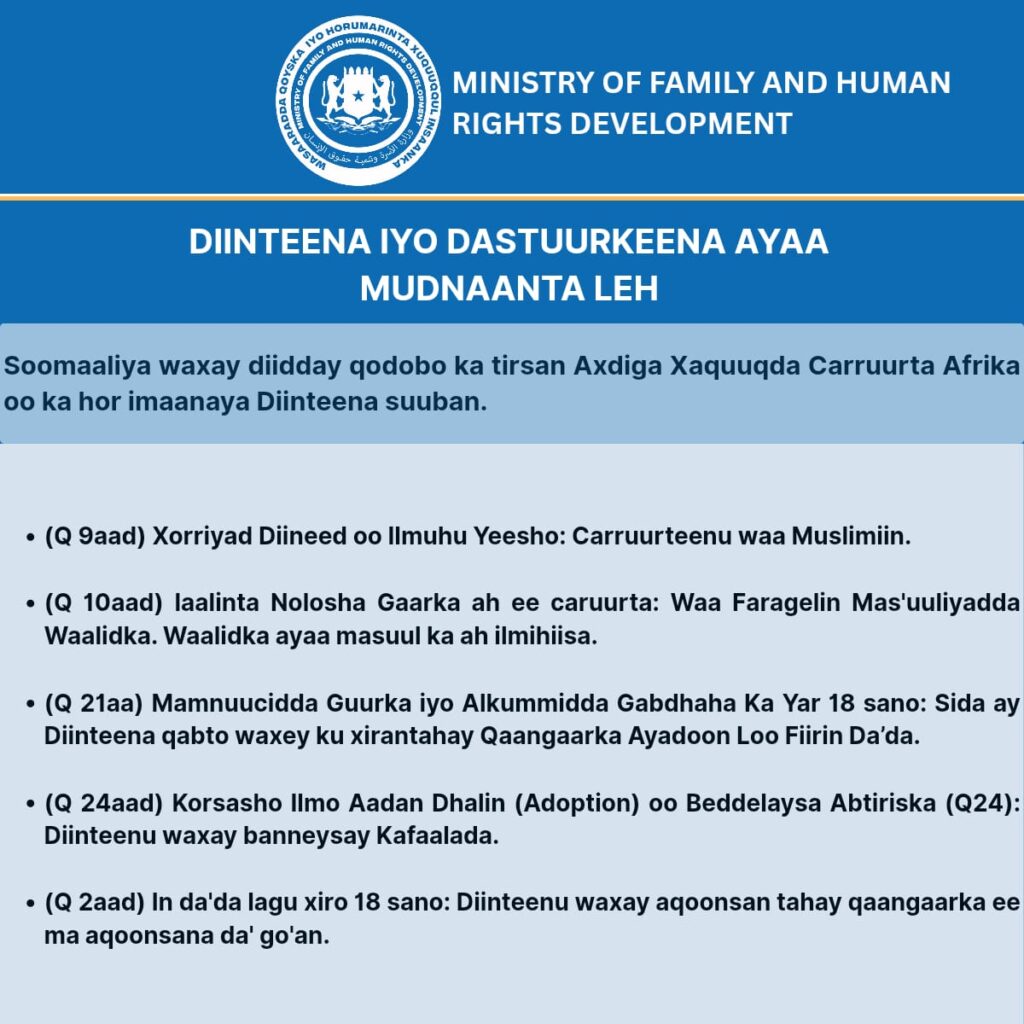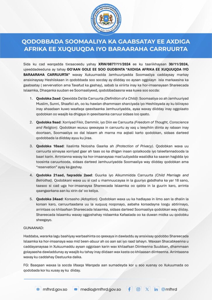 Soomaaliya waxay diidday qodobo ka tirsan Axdiga Xaquuqda Carruurta Afrika oo ka hor imaanaya Diinteena suuban.